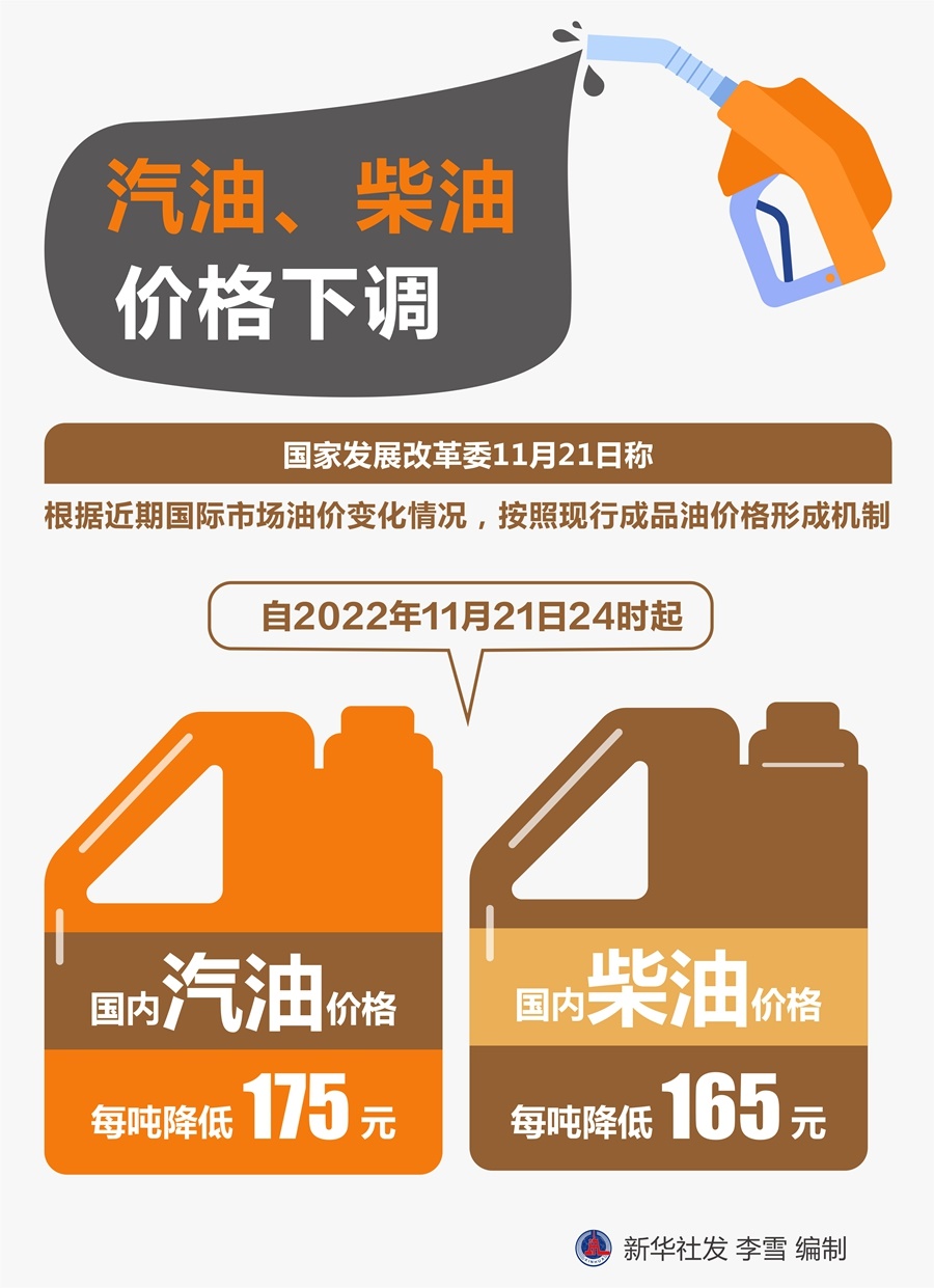 國家發(fā)展改革委21日稱,根據(jù)近期國際市場油價變化情況,按照現(xiàn)行成品油價格形成機制,自2022年11月21日24時起,國內(nèi)汽油、柴油價格每噸分別降低175元和165元。
