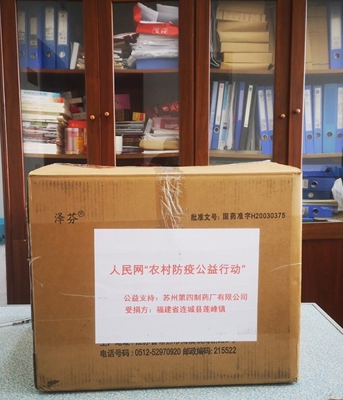 福建省連城縣蓮峰鎮(zhèn)收到蘇州第四制藥廠通過人民網(wǎng)“防疫互助平臺(tái)”捐贈(zèng)的右布洛芬膠囊。曾金水?dāng)z