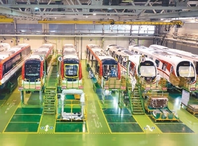 2023年2月14日,湖南省中車株洲電力機(jī)車有限公司城軌事業(yè)部總成車間,技術(shù)人員在加緊組裝城軌車輛,趕制國內(nèi)外客戶訂單。李 健攝(人民圖片)