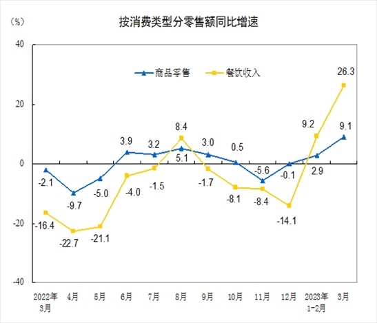 按消費(fèi)類型分,3月份,商品零售34148億元,同比增長9.1%;餐飲收入3707億元,增長26.3%。1—3月份,商品零售102786億元,同比增長4.9%;餐飲收入12136億元,增長13.9%。