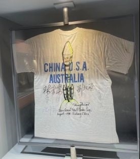 再給大家推薦一個(gè)不容錯(cuò)過的“打卡點(diǎn)”:澳星發(fā)射成功紀(jì)念T恤。這件T恤全部都是著名航天老專家們的“親簽”:林宗棠(時(shí)任航空航天部部長(zhǎng))、劉紀(jì)原(時(shí)任航空航天部副部長(zhǎng))、沈辛蓀(時(shí)任中國(guó)運(yùn)載火箭研究院院長(zhǎng))、王德臣(時(shí)任長(zhǎng)二E火箭總設(shè)計(jì)師)、屠守鍔(時(shí)任長(zhǎng)二E火箭技術(shù)總顧問)等。在紀(jì)念T恤的C位,還有劉竹生院士親筆畫的長(zhǎng)征二號(hào)E運(yùn)載火箭(即“長(zhǎng)二捆”火箭)的漫畫圖??芍^眾“星”云集,珍貴程度可想而知。