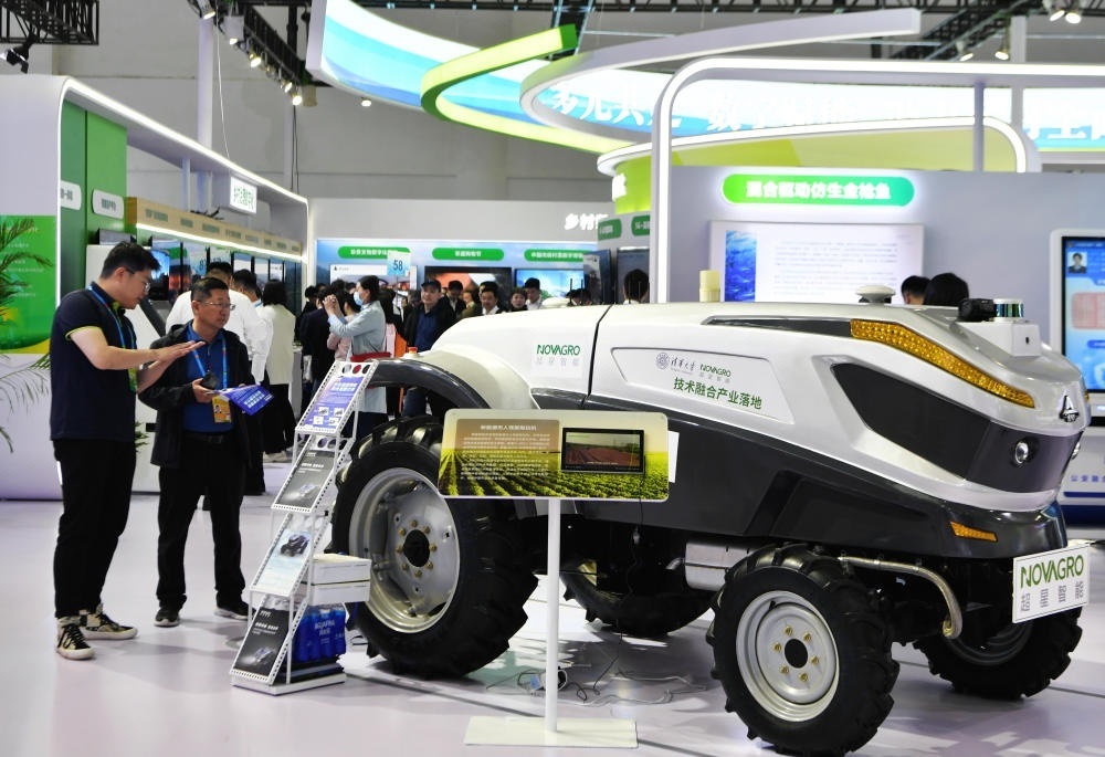 在第六屆數(shù)字中國(guó)建設(shè)峰會(huì)智慧農(nóng)業(yè)展廳展出的新能源無(wú)人駕駛智能拖拉機(jī)吸引參觀者駐足觀看(4月26日攝)。新華社記者 魏培全 攝