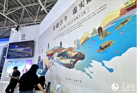 “我們對(duì)北京中軸線的場(chǎng)景進(jìn)行了復(fù)刻,構(gòu)筑了中軸線元宇宙,如果游客觀光北京中軸線上的打卡點(diǎn),用手機(jī)掃描眼前的景色,就會(huì)出現(xiàn)現(xiàn)實(shí)與虛擬交織的場(chǎng)景,仿佛穿越古今,置身于千百年前的時(shí)空?!北本┖訄D公司工作人員陳頌在展會(huì)現(xiàn)場(chǎng)介紹說(shuō)。
