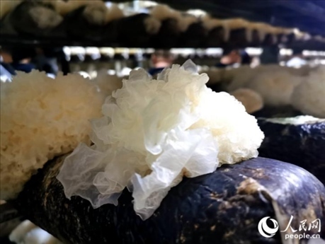 在福建省寧德市古田縣大橋鎮(zhèn)的一處標(biāo)準(zhǔn)化銀耳菇房,一個(gè)個(gè)整齊排列的架子上,培養(yǎng)基中長(zhǎng)出一朵朵晶瑩的“白花”。由于銀耳需要避光、溫暖的生長(zhǎng)環(huán)境,溫控智能化設(shè)備通過(guò)霧化、控溫等多項(xiàng)功能,模擬出銀耳在野生環(huán)境的生長(zhǎng)條件。
