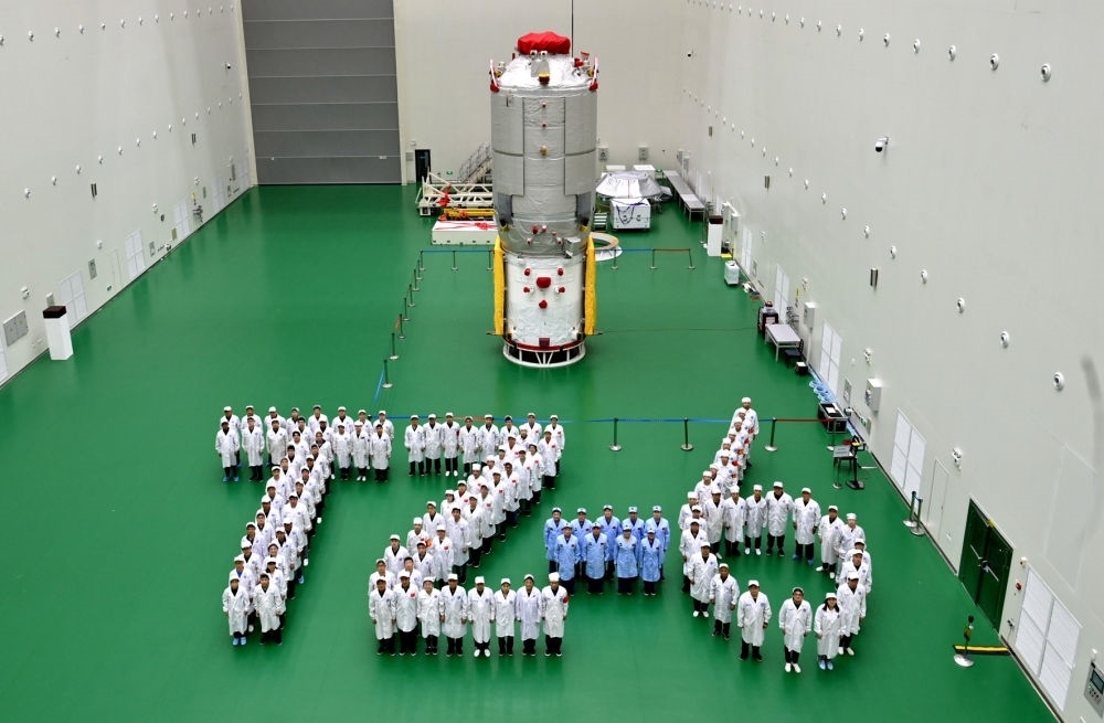 天舟六號(hào)貨運(yùn)飛船八院試驗(yàn)隊(duì)和天舟六號(hào)推進(jìn)艙合影。(中國航天科技集團(tuán)八院供圖)