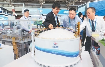 11月29日,在北京舉行的首屆中國國際供應(yīng)鏈促進(jìn)博覽會(huì)上,參觀者了解中海石油獨(dú)創(chuàng)的擁有自主知識(shí)產(chǎn)權(quán)的全容式液化天然氣(LNG)儲(chǔ)罐。陳曉根攝(人民視覺)