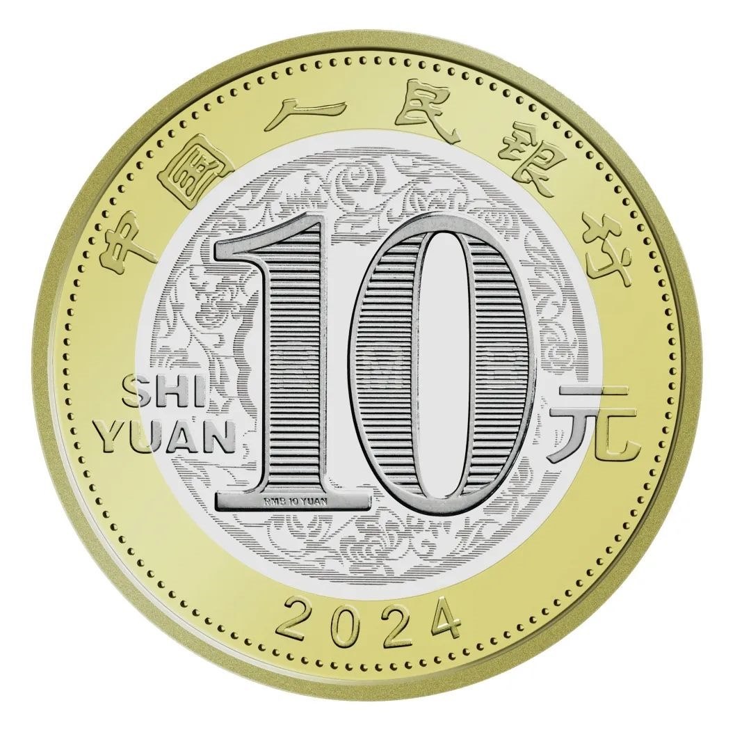 雙色銅合金紀(jì)念幣正面圖案為“中國(guó)人民銀行”、“10元”字樣,漢語(yǔ)拼音字母“SHIYUAN”及年號(hào)“2024”,底紋襯以團(tuán)花圖案。