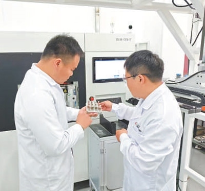 科研人員在檢查“材料數(shù)據(jù)工廠”高通量設備制備的多組元合金樣品。