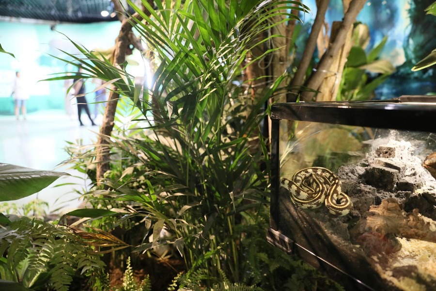 此次展覽主要以實(shí)景植物造景、活體動物和圖文展板相結(jié)合的方式進(jìn)行展示。其中活體動物有30多種約300只,包括鸚鵡、守宮、蛇、蜥蜴等鳥類和爬行類動物。