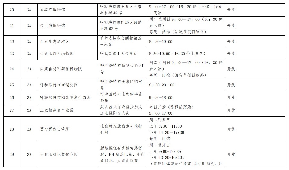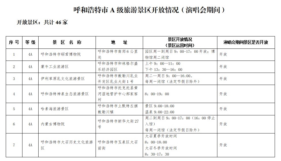 呼和浩特市(演唱會期間)A級旅游景區(qū)開放情況早知道