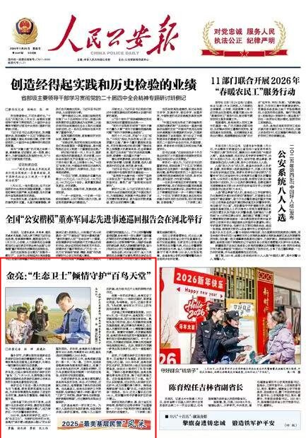 2026年1月25日《人民公安報》頭版刊發(fā)了《金亮:“生態(tài)衛(wèi)士”傾情守護“百鳥天堂”》的文章,報道了內蒙古扎賚特旗公安局圖牧吉國家級自然保護區(qū)森林公安派出所所長金亮的故事。作為一名當地的“生態(tài)衛(wèi)士”,金亮與保護區(qū)相伴的24年,參與辦理治安案件2000余起、刑事案件400余起,查處違法犯罪嫌疑人2600余名。金亮用實際行動踐行著“守護好祖國北疆綠水青山”的偉大使命。