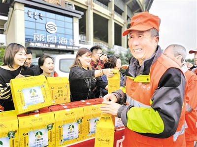 領(lǐng)到月餅的環(huán)衛(wèi)工人喜笑顏開(kāi) 攝影/梁良