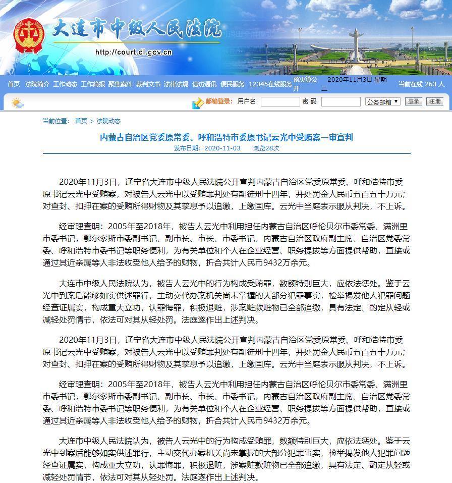 2020年11月3日,遼寧省大連市中級(jí)人民法院公開宣判內(nèi)蒙古自治區(qū)黨委原常委、呼和浩特市委原書記云光中受賄案,對(duì)被告人云光中以受賄罪判處有期徒刑十四年,并處罰金人民幣五百五十萬元;對(duì)查封、扣押在案的受賄所得財(cái)物及其孳息予以追繳,上繳國庫。云光中當(dāng)庭表示服從判決,不上訴。