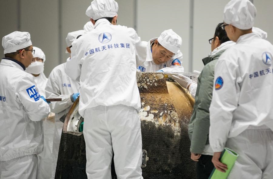 2020年12月17日,在中國航天科技集團五院,科研人員打開嫦娥五號返回器艙門,取出裝有月球樣品的容器并進行稱重。新華社記者金立旺攝