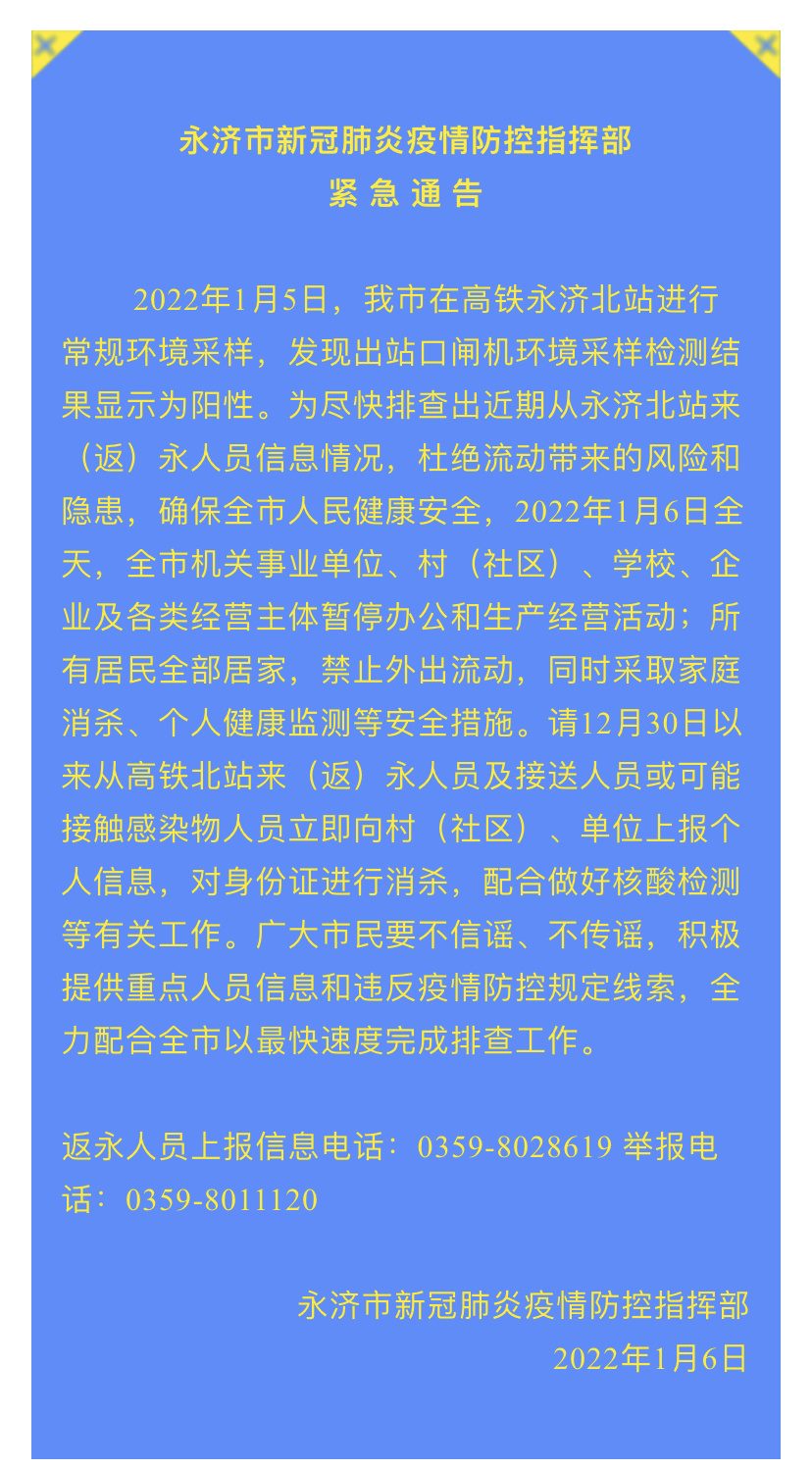 2022年1月5日,山西省永濟市在高鐵永濟北站進行常規(guī)環(huán)境采樣,發(fā)現(xiàn)出站口閘機環(huán)境采樣檢測結(jié)果顯示為陽性。為盡快排查出近期從永濟北站來(返)永人員信息情況,杜絕流動帶來的風(fēng)險和隱患,確保全市人民健康安全,1月6日全天,全市機關(guān)事業(yè)單位、村(社區(qū))、學(xué)校、企業(yè)及各類經(jīng)營主體暫停辦公和生產(chǎn)經(jīng)營活動;所有居民全部居家,禁止外出流動,同時采取家庭消殺、個人健康監(jiān)測等安全措施。請12月30日以來從高鐵北站來(返)永人員及接送人員或可能接觸感染物人員立即向村(社區(qū))、單位上報個人信息,對身份證進行消殺,配合做好核酸檢測等有關(guān)工作。廣大市民要不信謠、不傳謠,積極提供重點人員信息和違反疫情防控規(guī)定線索,全力配合全市以最快速度完成排查工作。