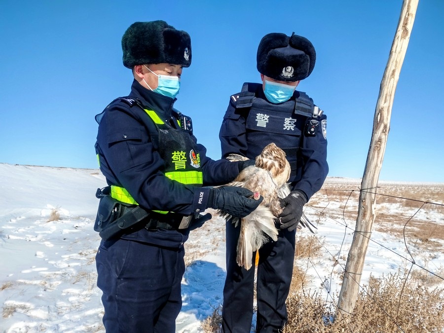 北疆新聞網(wǎng)、北疆新聞APP、北疆云消息(記者 劉嬙 通訊員 張路 張冬)2月10日,內(nèi)蒙古烏蘭察布市四子王旗腦木更邊境派出所民警在執(zhí)勤巡邏途中,發(fā)現(xiàn)一只“大鳥”被困在網(wǎng)圍欄上。民警靠近后仔細觀察發(fā)現(xiàn),這只“大鳥”在奮力撲打翅膀但無法飛行,右爪缺失,受傷嚴(yán)重。民警通過手機搜索網(wǎng)絡(luò)圖片比對,初步判定為國家二級保護動物鷹隼。
