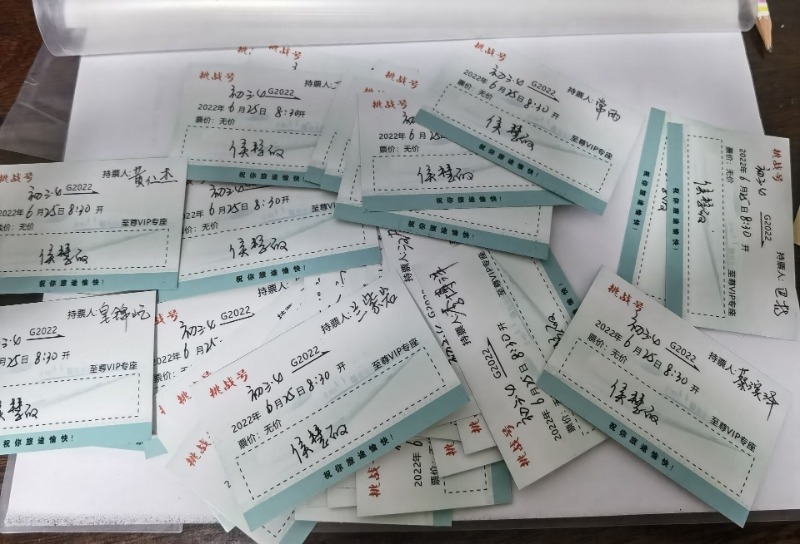 6月20日,呼和浩特市第五中學(xué)初三(4)班班主任侯慧敏老師給班里57名學(xué)生的手寫“告別信”刷屏朋友圈,紙短情長,愛意滿滿。每封信箋做成車票的樣式,正面寫著車次:“挑戰(zhàn)號(hào)”G2022;時(shí)間:2022年6月25日8時(shí)30分;座位:至尊VIP專座;票價(jià):無價(jià)?!敖K點(diǎn)站”并未填寫。侯慧敏說,那是孩子們的夢想,需要靠他們自己來完成。當(dāng)天的畢業(yè)班會(huì)上,當(dāng)每個(gè)學(xué)生打開信箋,滿滿的回憶和濃濃的情誼不禁讓孩子們潸然淚下。