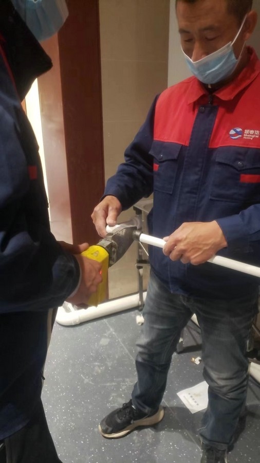 深夜,氣溫突降,冷風(fēng)毫不留情地灌入現(xiàn)場施工人員的衣服里,但無一人松勁、無一人退縮。由于材料分布范圍較大,只見身穿紅、藍工作服的他們徒步穿梭于各樓層之間,一刻不停地搬運管件及材料、安裝設(shè)備。因疫情管控不能到現(xiàn)場的同事則堅持利用通訊工具提供遠程技術(shù)支持,為前線答疑解惑。方艙醫(yī)院建設(shè)屬于應(yīng)急工程,時間緊、任務(wù)重,加之現(xiàn)場材料缺乏,施工人員只能就地取材,爭分奪秒的同時,“突擊隊”表現(xiàn)出了高度的專業(yè)性,迅速、細致、高效地進行管道鋪設(shè)和熱水器安裝……凌晨4點,在現(xiàn)場全體施工人員的共同努力下,方艙醫(yī)院水暖安裝工作順利完成。