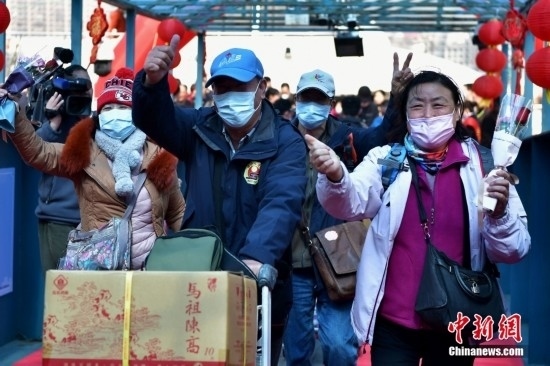 2月19日,搭載59名旅客的“吉順9號(hào)”客輪緩緩駛?cè)敫V葸B江黃岐客運(yùn)碼頭,標(biāo)志著連江黃岐至馬祖白沙“小三通”客運(yùn)航線復(fù)航。此前,廈門(mén)-金門(mén)客運(yùn)航線、福州馬尾-馬祖客運(yùn)航線、泉州-金門(mén)客運(yùn)航線已相繼復(fù)航。圖為兩岸鄉(xiāng)親在黃岐客運(yùn)碼頭激動(dòng)相擁。中新社記者 張斌 攝