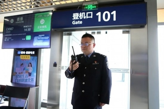 圖為亢杰在登機(jī)口匯報(bào)出境航班登機(jī)情況。