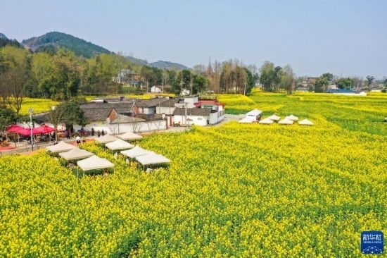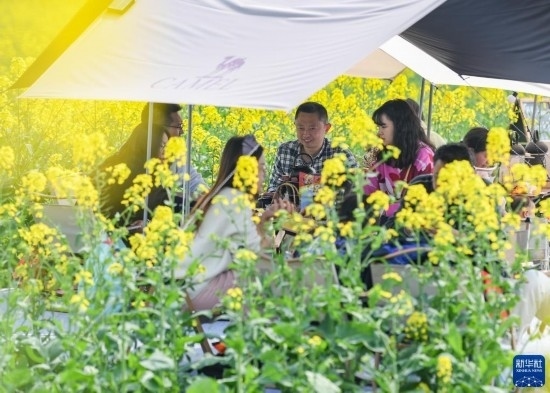近日,位于四川成都崇州市的數(shù)萬畝油菜花競相綻放,吸引游客前來踏春觀光。