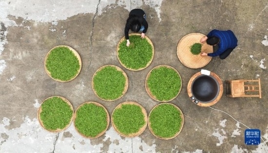 3月20日,在湖南衡陽常寧市塔山瑤族鄉(xiāng),茶農(nóng)在炒茶(無人機(jī)照片)。