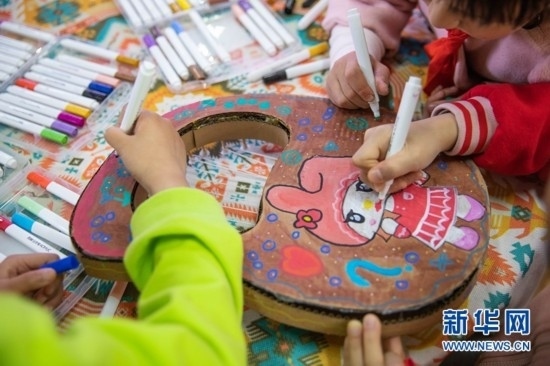 在成都市金牛區(qū)西北街社區(qū)的服務大廳一角,一群孩子正為紙板制作的各族樂器繪畫著色。