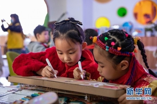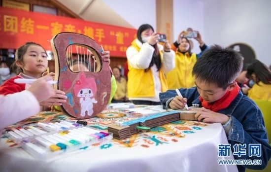 8歲的土旦卡卓是來自青海玉樹藏族自治州的藏族小朋友,她在為手中紙質瑤琴涂畫的同時也學習著其他民族的文化風俗。