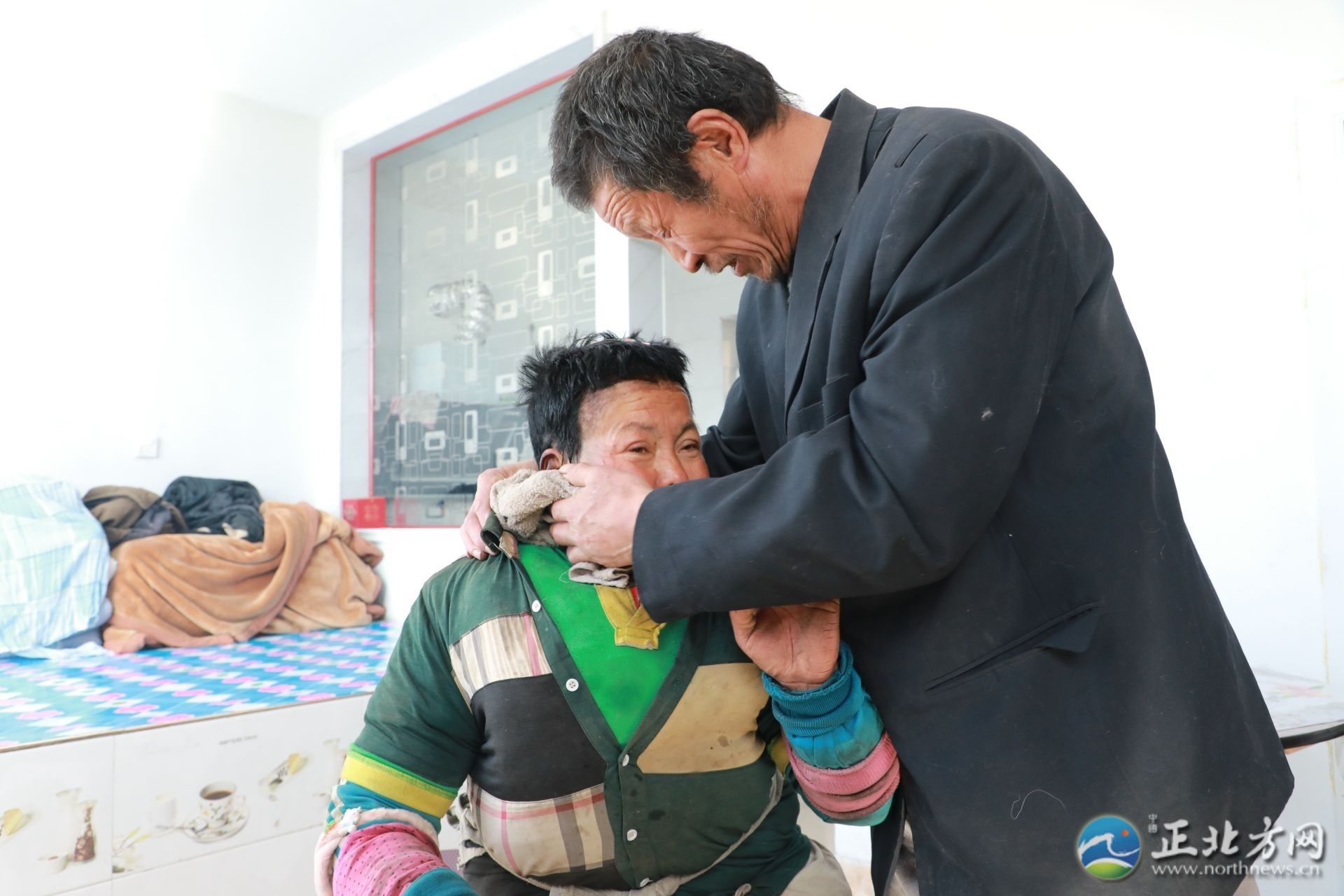 在采訪間隙,何蘭鎖的妻子王林愛回到了家,見到有陌生人顯得很局促。王林愛患有精神疾病,說話顛三倒四。何蘭鎖拿起毛巾,溫柔地為妻子擦拭沾滿灰塵的臉和手,端出早早做好的飯放在桌上:“快吃吧,有你最愛吃的咸菜?!薄傲謵燮鋵?shí)命最苦了,啥也懂不得,我要不在了,她一個人可咋辦呀。我現(xiàn)在最大的心愿是希望能讓她去接受治療。”何蘭鎖止不住地哽咽道。