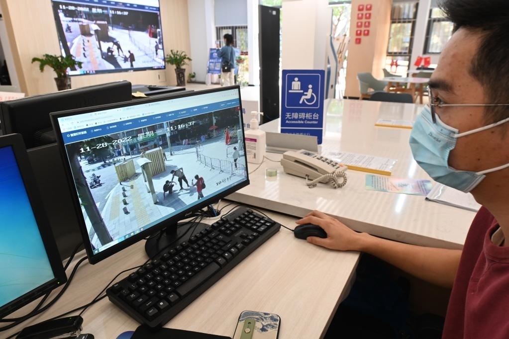 2022年11月28日,福州市福瑞社區(qū)便民服務中心社區(qū)智慧平臺可即時收到小區(qū)周邊智慧燈桿監(jiān)控拍攝到的路面情況,以及路人需要幫助的信息等。新華社記者林善傳攝