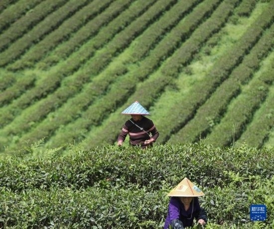 4月15日,貴州省開陽縣南龍鄉(xiāng)東官村一生態(tài)茶園,茶農(nóng)在采摘春茶。