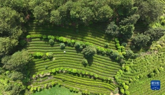 4月15日拍攝的貴州省開陽縣南龍鄉(xiāng)田坎村的茶園(無人機照片)。