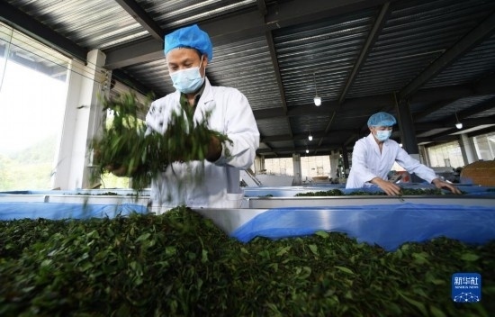 4月15日,在貴州省開陽縣南龍鄉(xiāng)翁朵村一茶葉加工廠,工人在攤晾茶青(無人機照片)。