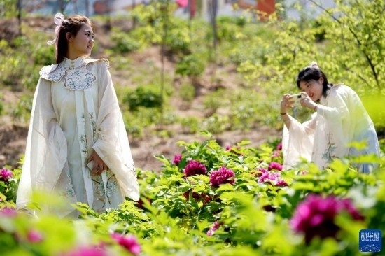 4月16日,游客在白臺峪村牡丹農(nóng)業(yè)產(chǎn)業(yè)園拍照游玩。