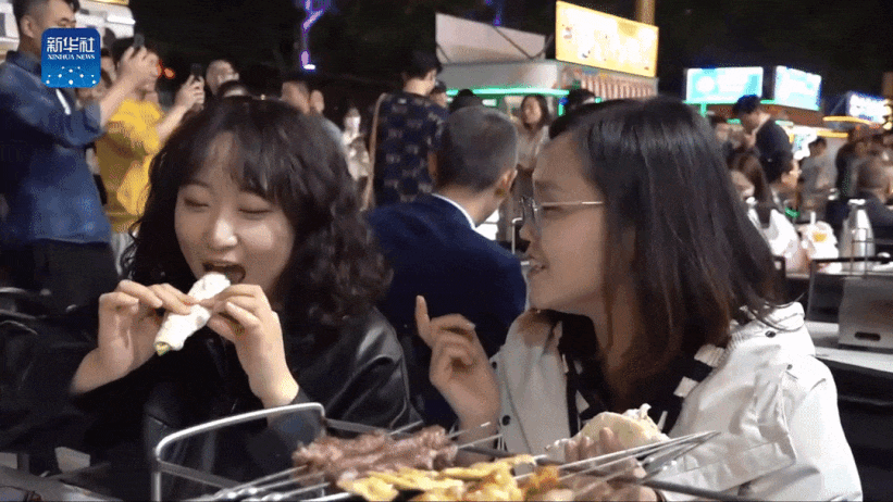 4月14日晚,新華社記者正在進(jìn)行“沉浸式打卡淄博燒烤”直播。圖為直播畫面動圖。