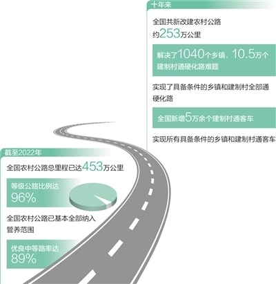 一條條“四好農(nóng)村路”修到村頭,通到了鄉(xiāng)親們的家門口。截至2022年,全國農(nóng)村公路總里程已達(dá)453萬公里,等級(jí)公路比例達(dá)96%。十年來,我國支持貧困地區(qū)新改建了6.5萬公里資源路、旅游路、產(chǎn)業(yè)路。