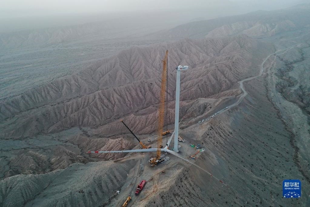 在新疆克孜勒蘇柯?tīng)柨俗巫灾沃轂跚】h,風(fēng)機(jī)葉輪提升至相應(yīng)高度后與機(jī)艙對(duì)接(4月21日攝)。