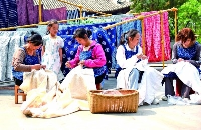 云南巍山縣,幾位民族工藝廠女員工在進(jìn)行非遺扎染產(chǎn)品制作。張樹祿攝/光明圖片