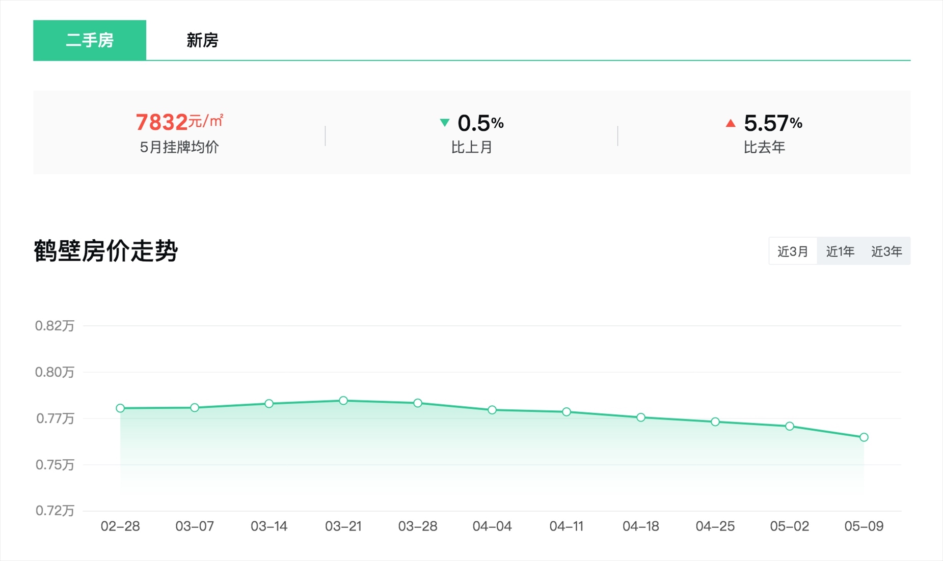 從安居客平臺(tái)上可以看到,5月,鶴壁整體的二手房掛牌均價(jià)為7832元/平方米,環(huán)比下跌0.5%,同比上漲5.57%。下轄的5個(gè)行政區(qū)的房價(jià)差異則較大。其中,鶴壁新區(qū)淇濱區(qū)二手房掛牌均價(jià)為7565元/平方米,環(huán)比下跌0.68%,同比上漲3.49%;而老城區(qū)山城區(qū)二手房的掛牌價(jià)僅顯示1465元/平方米。