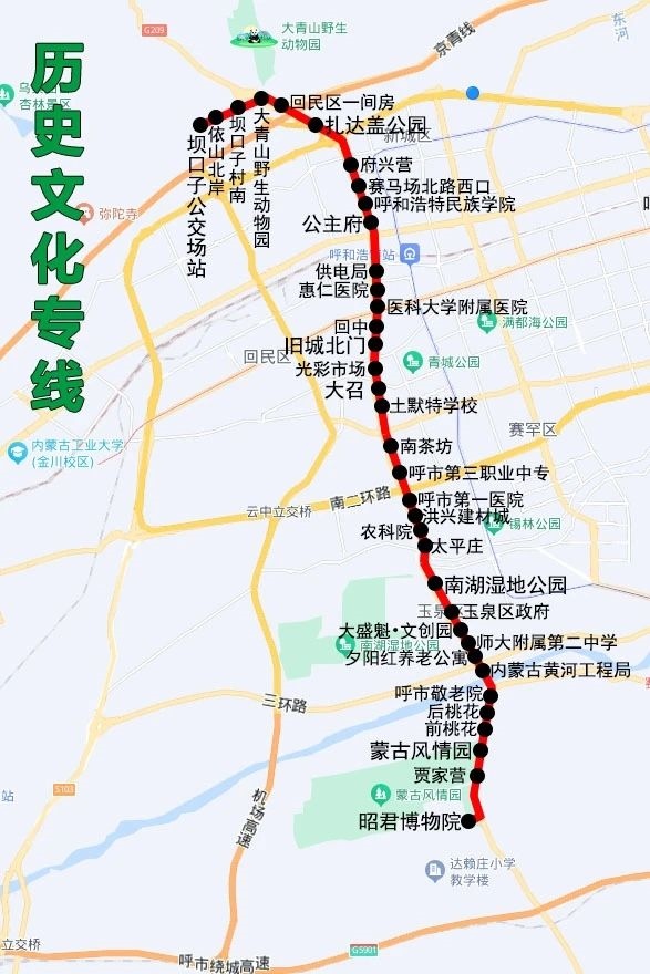 沿途設站:壩口子公交場站、依山北岸、壩口子村南、大青山野生動物園、回民區(qū)一間房、扎達蓋公園、府興營、賽馬場北路西口、呼和浩特民族學院、公主府、供電局、匯仁醫(yī)院、醫(yī)科大學附屬醫(yī)院、回中、舊城北門、光彩市場、大召、土默特學校、南茶坊、呼市第三職業(yè)中學、呼市第一醫(yī)院、洪興建材城、農(nóng)科院、太平莊、南湖濕地公園、玉泉區(qū)政府、大盛魁文創(chuàng)園、師大附屬第二中學、夕陽紅養(yǎng)老公寓、內(nèi)蒙古黃河工程局、呼市敬老院、后桃花、前桃花、蒙古風情園、賈家營、昭君博物院。