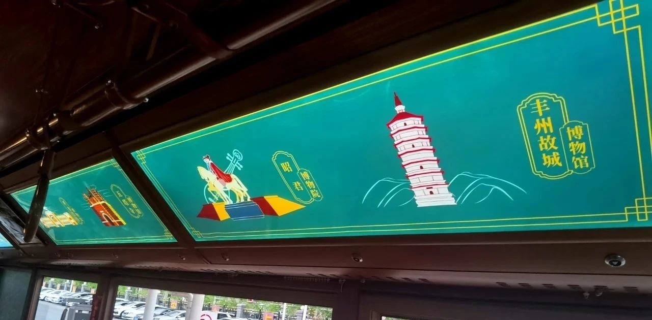 除了復古風的車身外型,主題車廂內(nèi)也充滿了如詩如畫的文旅元素,為乘客們顯示了五塔寺、昭君博物院、豐州故城博物館等本土旅游勝地,乘坐鐺鐺車,乘客在瀏覽美麗街景的同時,也可通過車內(nèi)看板了解到青城的名勝古跡。