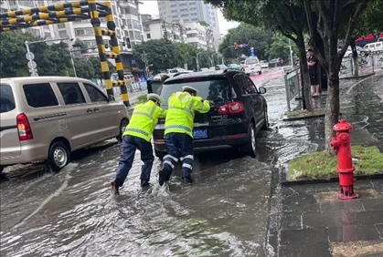 2023年5月22日,廣西桂林,受暴雨影響,城市道路積水嚴重,交警在積水中合力手推一輛拋錨的汽車。廣西桂林交警 圖