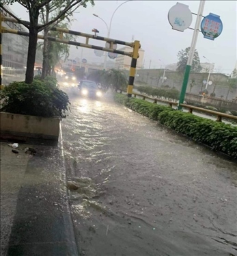 暴雨過后,城市道路積水嚴重,城區(qū)出現(xiàn)內澇,市民蹚水出行。