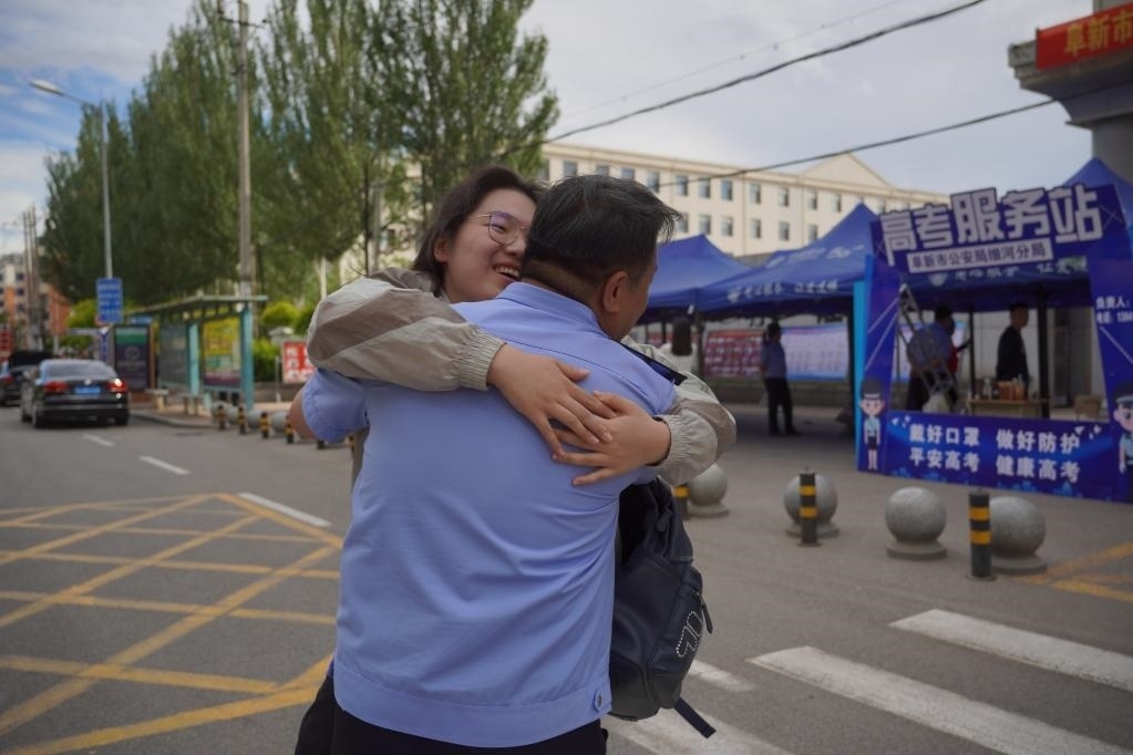 6月9日,在遼寧省阜新市海州高級中學考點,考生邢雨桐與身為考點執(zhí)勤民警的父親熱情相擁。新華社記者王瑩 攝