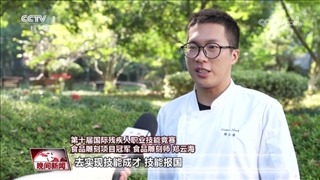 第十屆國際殘疾人職業(yè)技能競賽食品雕刻項目冠軍 食品雕刻師 鄭云海:最近有火炬(傳遞),寓意就是美好、和平,還有吉祥。我想用自己的技能去宣傳我們杭州亞運會的一個文化。