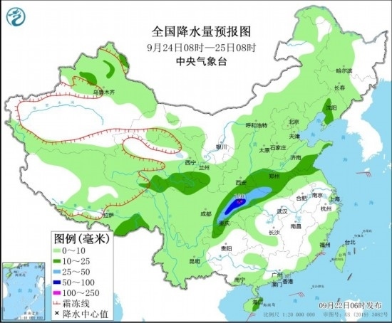 全國降水量預報圖(9月24日08時-25日08時)。圖片來源:中央氣象臺網站