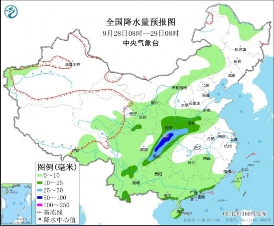 9月28日08時(shí)至29日08時(shí),西北地區(qū)東南部、陜西中部、黃淮西部、江漢西部、西南地區(qū)東北部、廣西東南部沿海、廣東東南部沿海等地部分地區(qū)有中到大雨,其中,陜西南部、四川盆地東北部、重慶東北部和西部等地部分地區(qū)有暴雨或大暴雨(100~120毫米)。黑龍江東北部部分地區(qū)有4~5級(jí)風(fēng)。