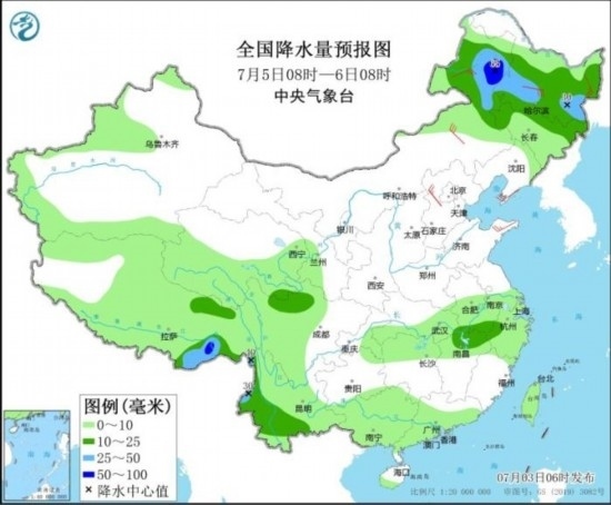 全國降水量預報圖(7月5日08時-6日08時)。圖片來源:中央氣象臺網站