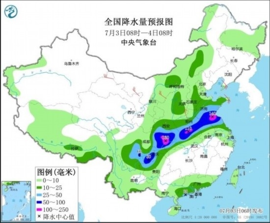 中央氣象臺7月3日06時繼續(xù)發(fā)布暴雨藍色預警:預計,7月3日08時至4日08時,山東中南部、江蘇北部、安徽北部、河南東部和南部、湖北北部和西部、陜西南部、重慶、四川東部、貴州西北部、云南東北部以及廣東西南部沿海等地部分地區(qū)有大到暴雨,其中,山東南部、江蘇北部、河南南部、重慶北部、四川東北部等地局地有大暴雨(100~160毫米)。上述部分地區(qū)伴有短時強降水(最大小時降雨量30~50毫米,局地可超過60毫米),局地有雷暴大風等強對流天氣。