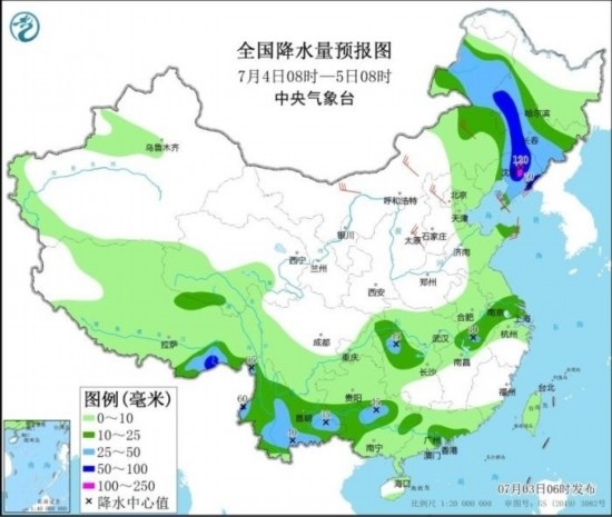 全國降水量預報圖(7月3日08時-4日08時)。圖片來源:中央氣象臺網站
